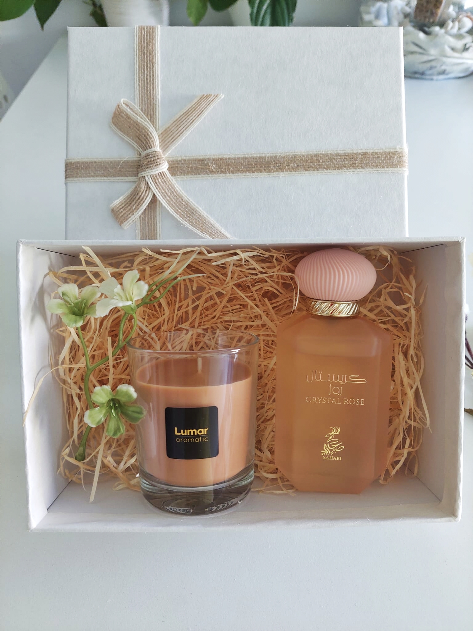 Un detalle elegante y femenino para decir “te pienso”. Este set combina el encanto del Crystal Rose Sahari con una vela aromática que crea un ambiente cálido y delicado. La fragancia abre con frambuesa y nardo, florece en neroli y jazmín, y se abraza a un fondo de almizcle blanco, vainilla y ámbar: una estela sofisticada y duradera para el día y la noche.